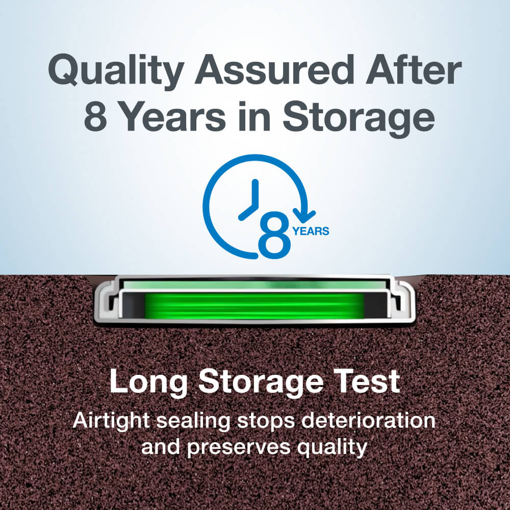 Panasonic’s innovative Anti-Leak Seal is exhaustively lab-tested in real-world appliances. The tough gasket’s rim is embedded in the case and is securely sealed with a custom anode cap and strong adhesive. Enhanced by low-degradation ingredients, our Anti-Leak Seal keeps you and your devices safe.